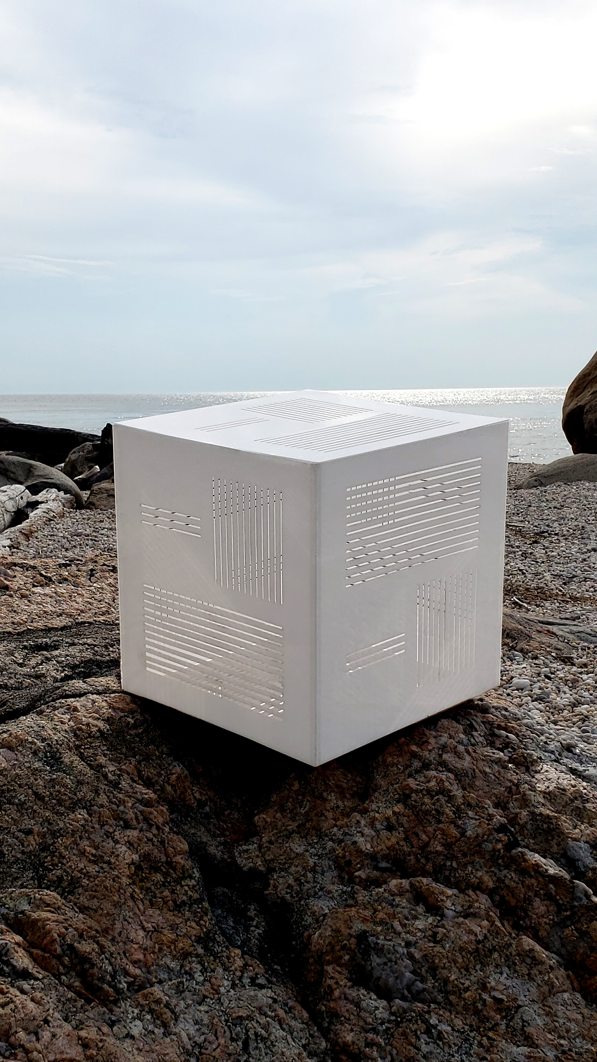 Starting with the classic minimalist form (the cube), Linje explores the dynamics of changing surface patterns and internal space in response to shifting environmental conditions as well as the perspective of the viewer. As a result of this dynamic, Linje is inherently a kinetic sculpture by nature in spite of its minimalist form.